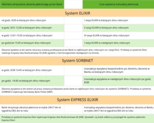 Harmonogram wysyłania i odbierania zleceń płatniczych realizowanych za pośrednictwem Systemu ELIXIR / SORBNET / EXPRESS ELIXIR