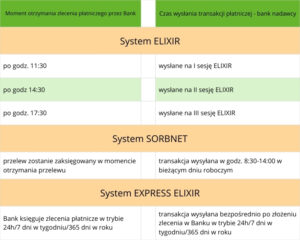Harmonogram przelewów realizowanych za pośrednictwem systemów ELIXIR/ SORBNET2/ Express ELIXIR może ulec zmianie z powodu ewentualnych niedostępności wskazanych systemów płatniczych lub systemów informatycznych Banku.